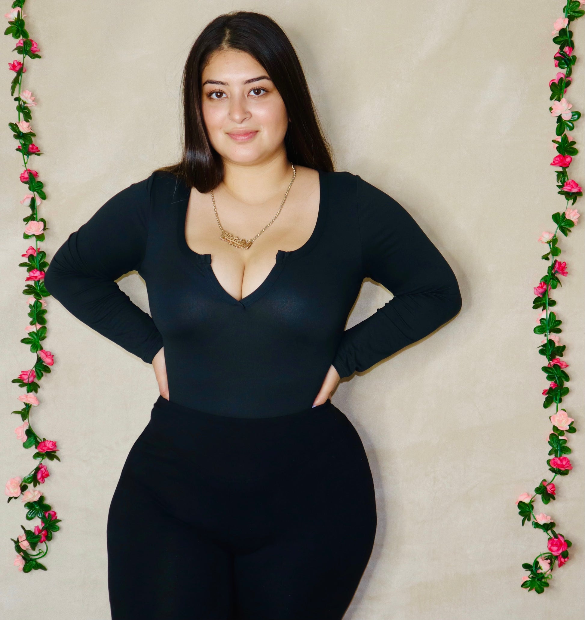 Split neck, Long sleeve black body suit, stretchy
