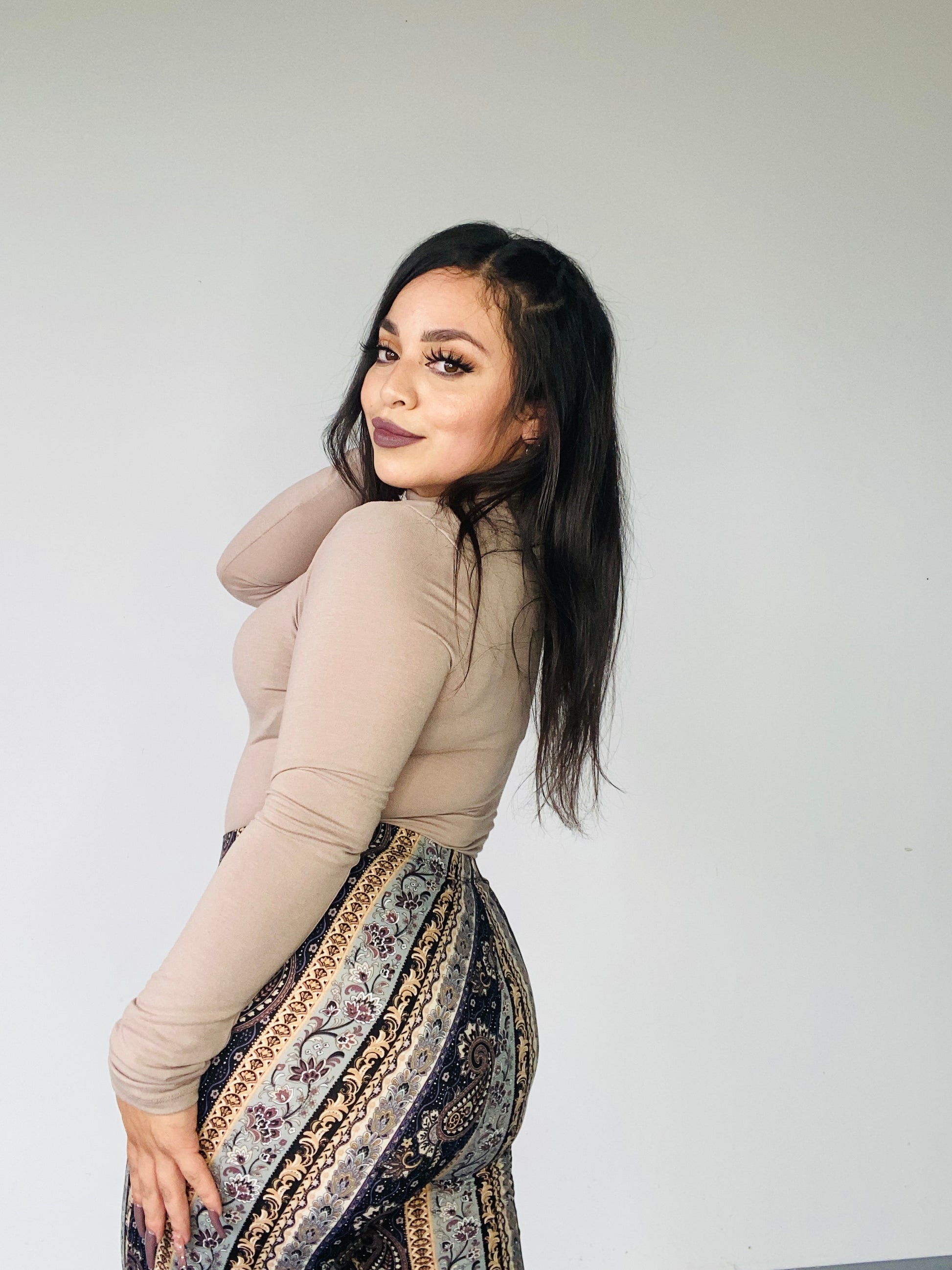 Mocha long sleeve, high neck bodysuit. Stretchy true to size