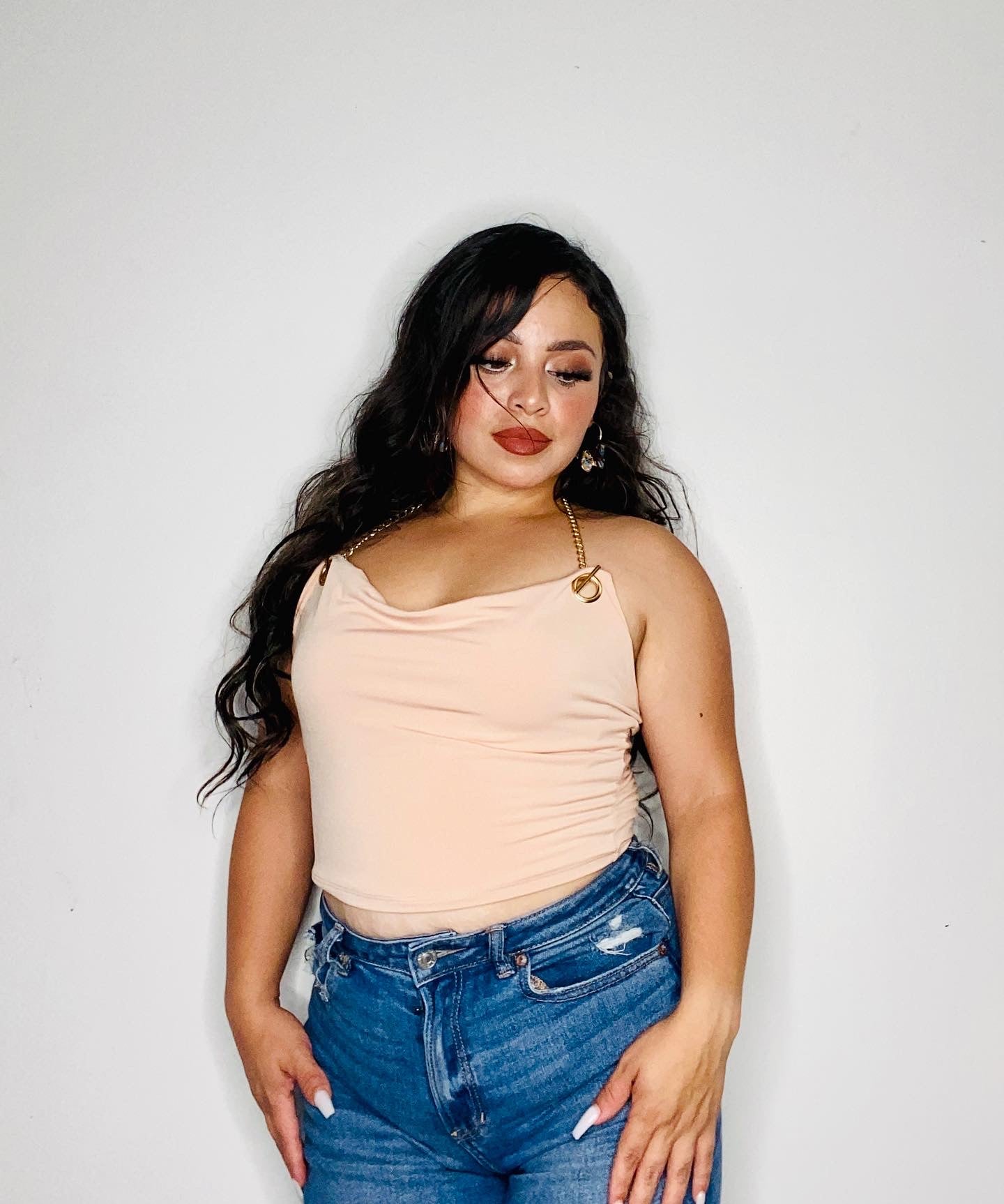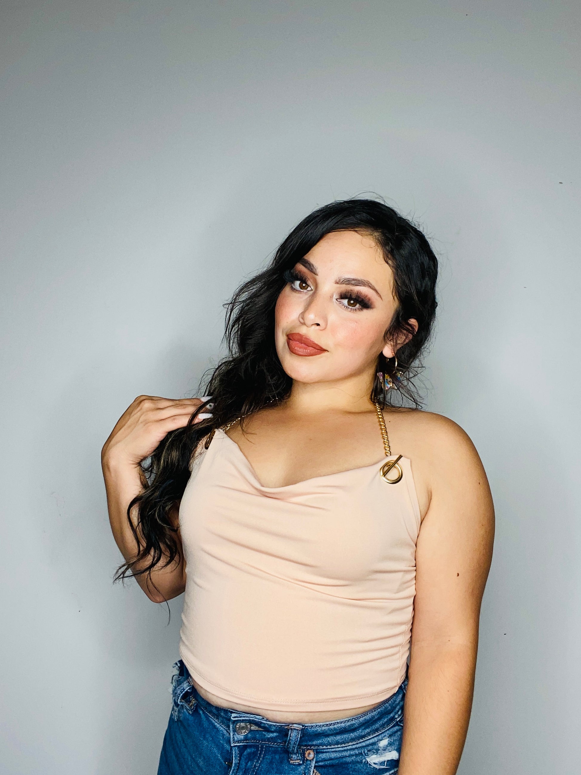Nude Chain neck detail, dainty top. Open back. Buttery soft material. S, M, L available. Model wearing S.