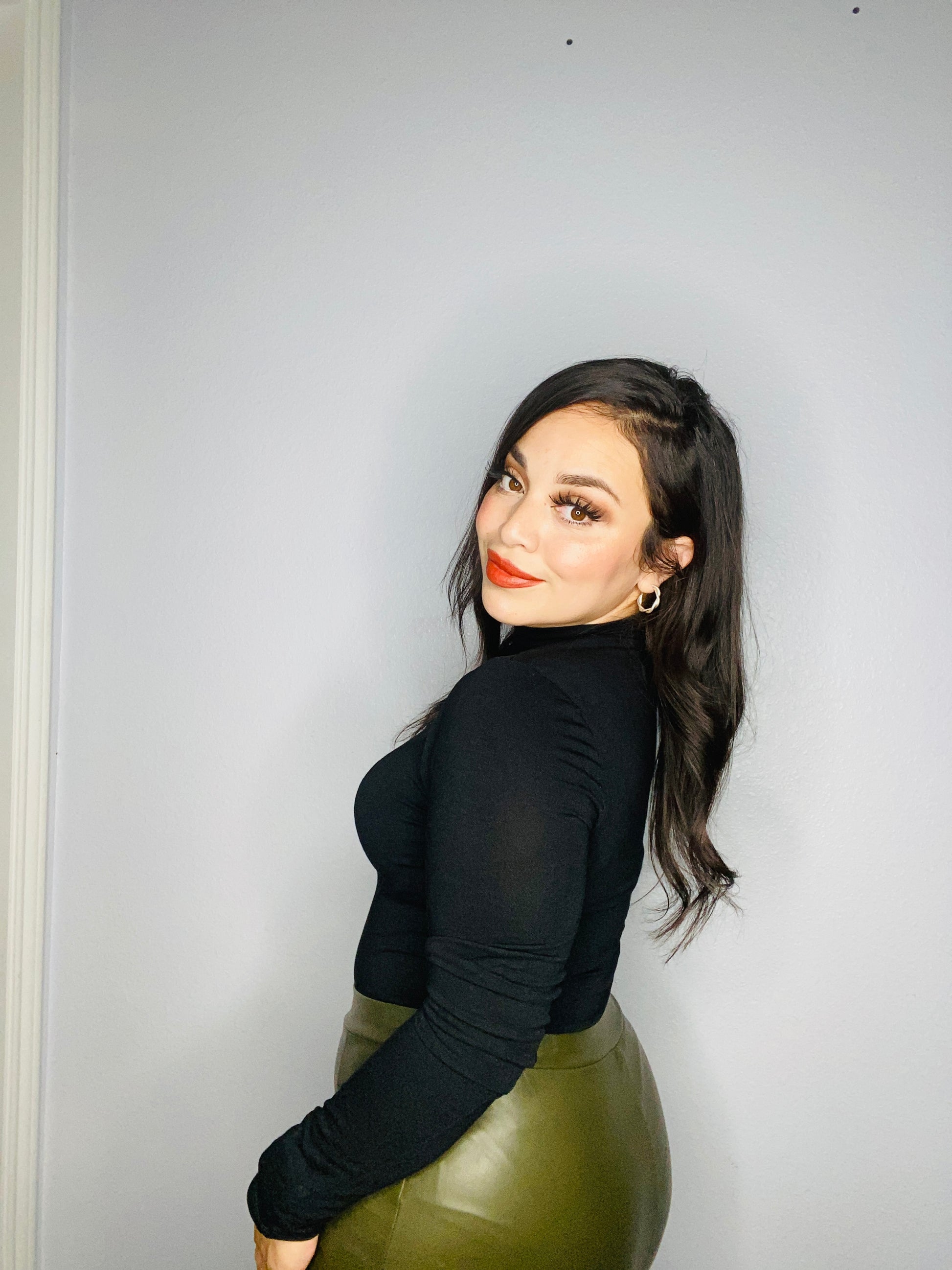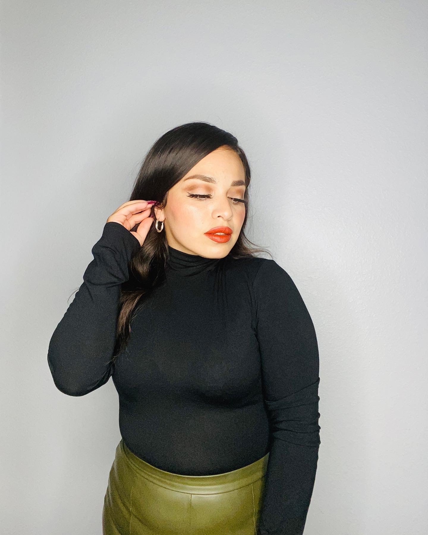 Black color high neck bodysuit, long sleeve, amazing stretch to it. The material consists of 57% polyester, 38% rayon, 5% spandex.