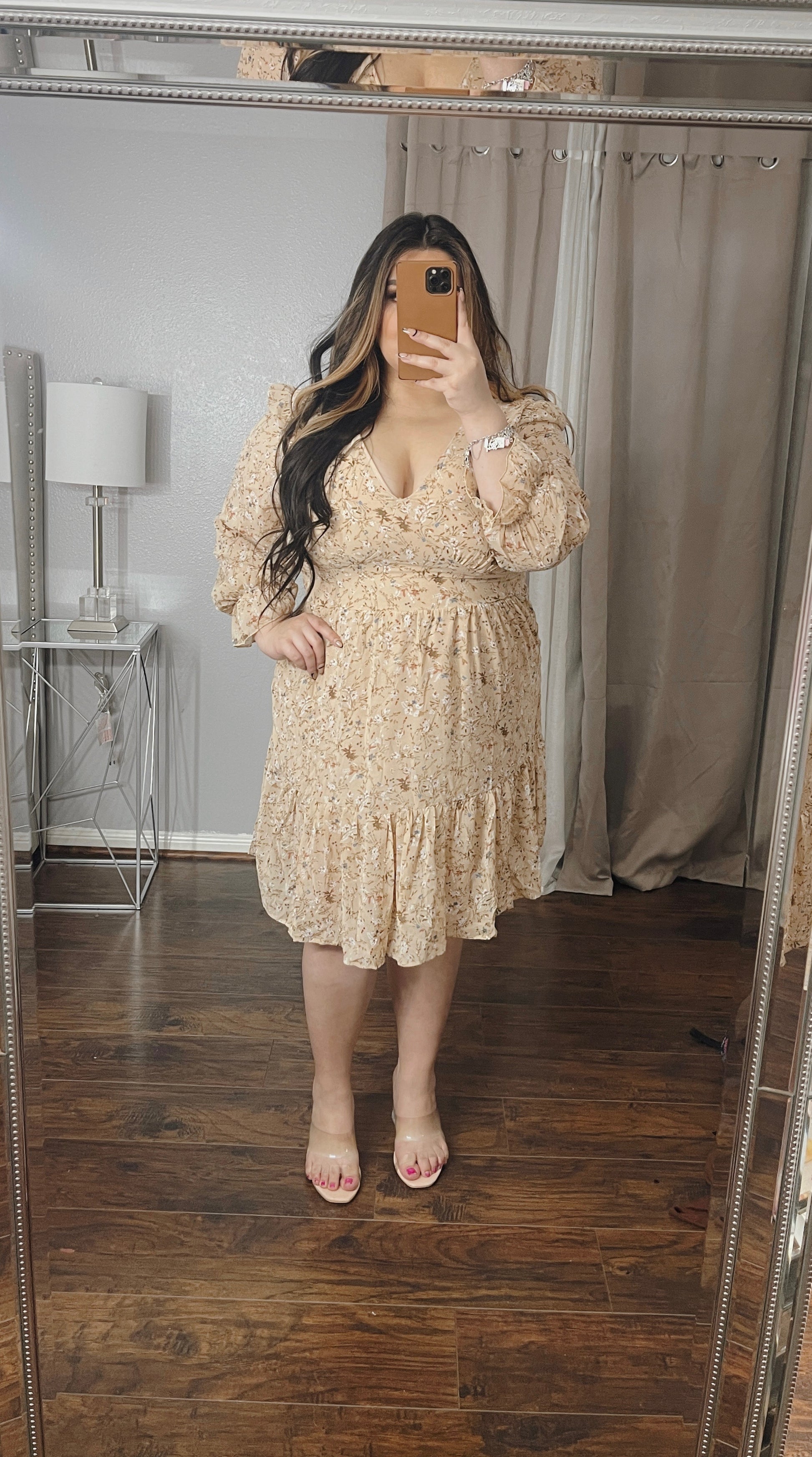 Gorgeous, beige, flowy midi dress. Long sleeves with some fashion puff 🤍 hugs at the wrists and ends with a beautiful touch of ruffles. Zipper up from the back. “Some stretch “ around the chest area.