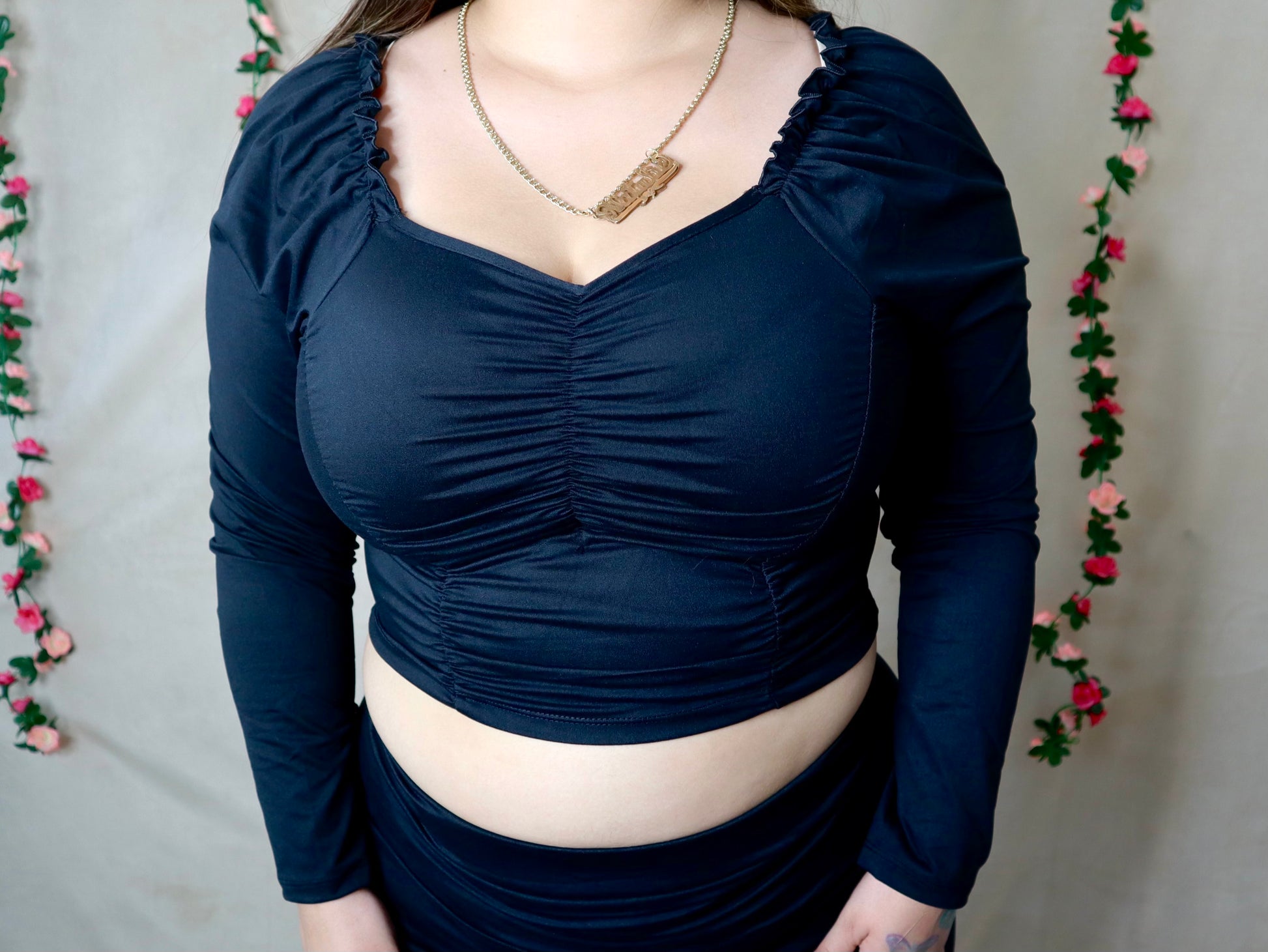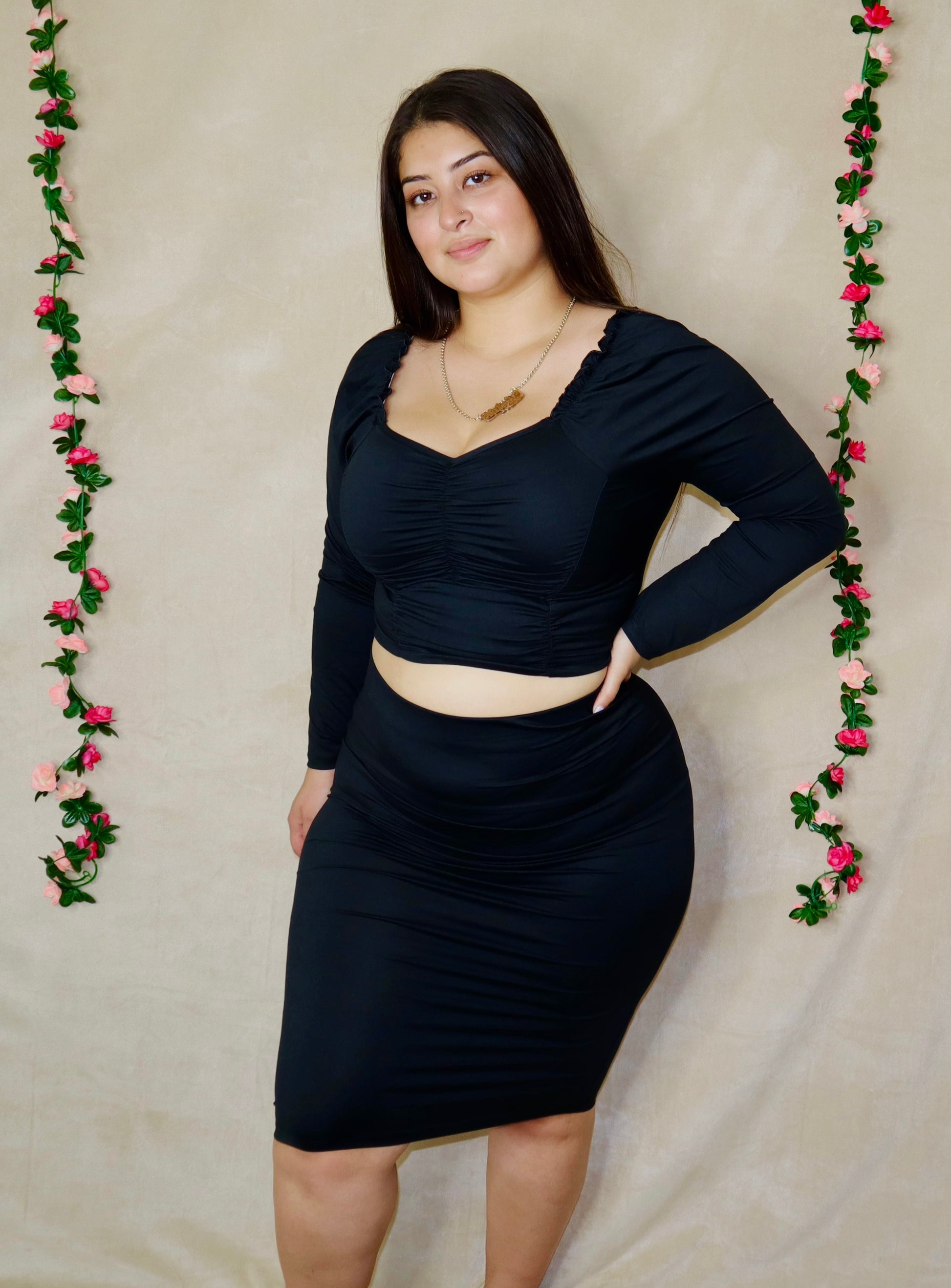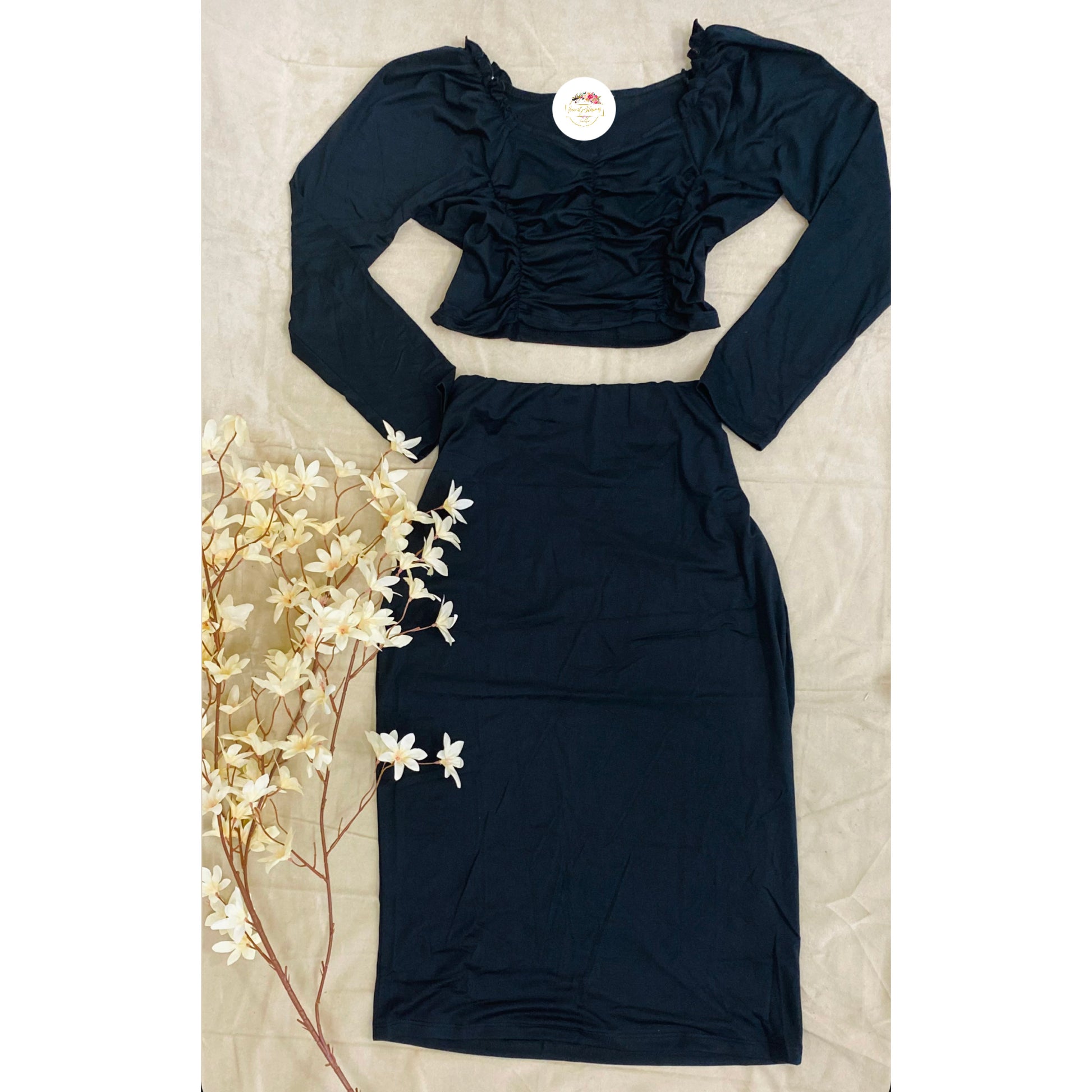 Jet black, 2 piece set, long sleeve crop top, with skirt, stretchy material.