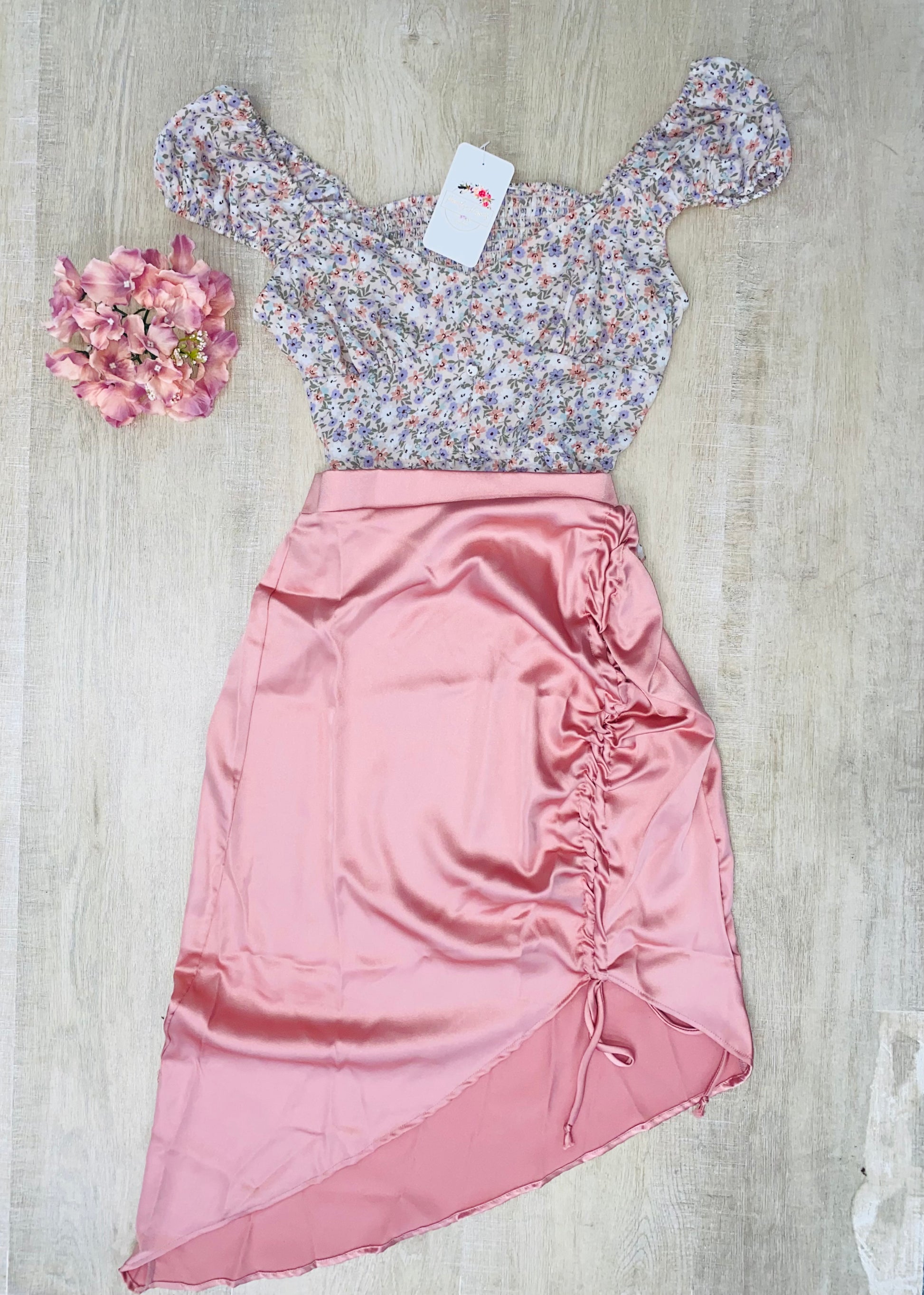 Rose pink silky skirt, cute scrunching detail down one side with adjustable strings. Zips up at the waist. (More pictures coming soon)