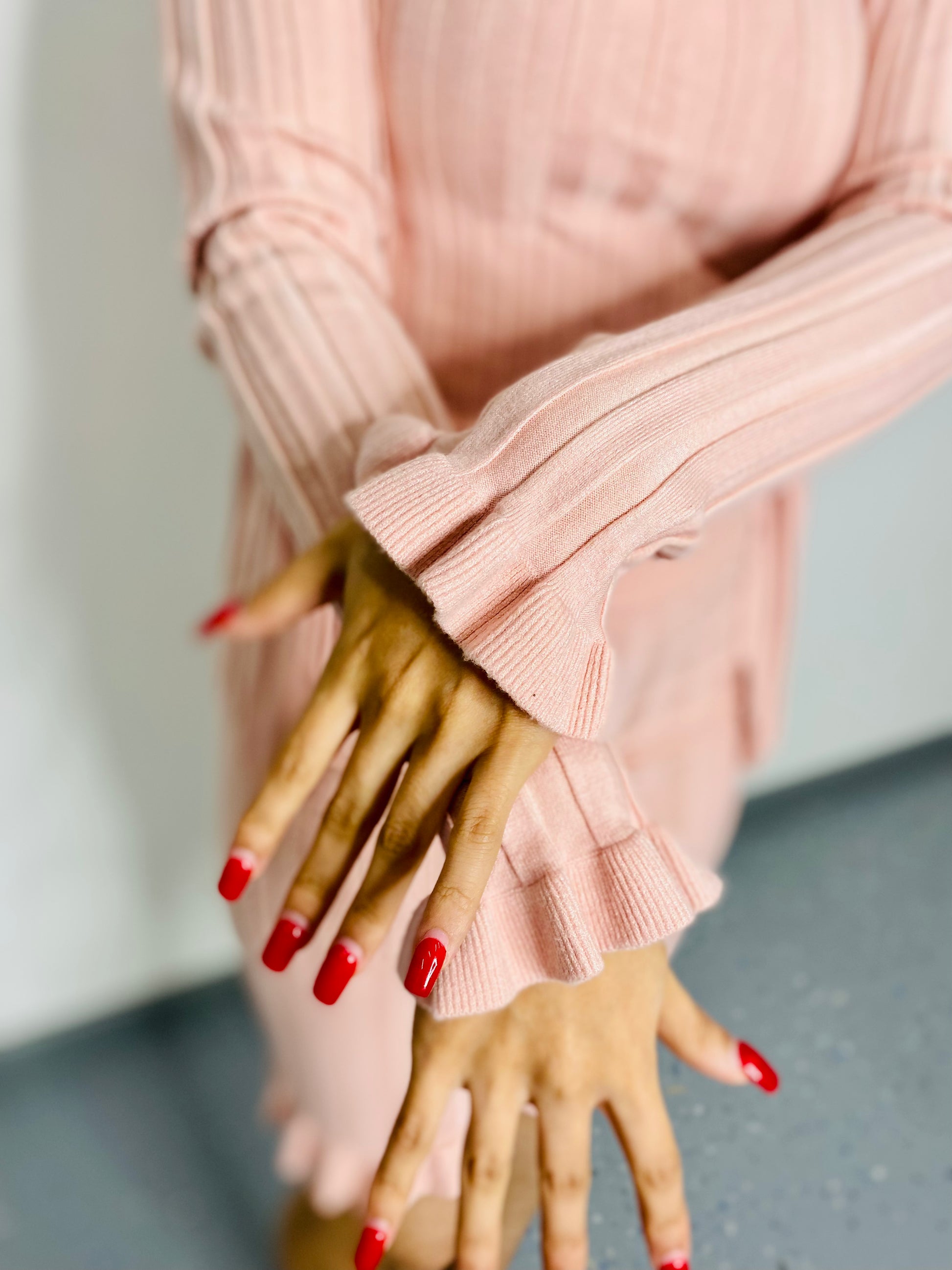 Classy, three piece, so buttery soft, thick ribbed line design with cute ruffles on the ends of the sleeves of cardigan and pencil high waist skirt!